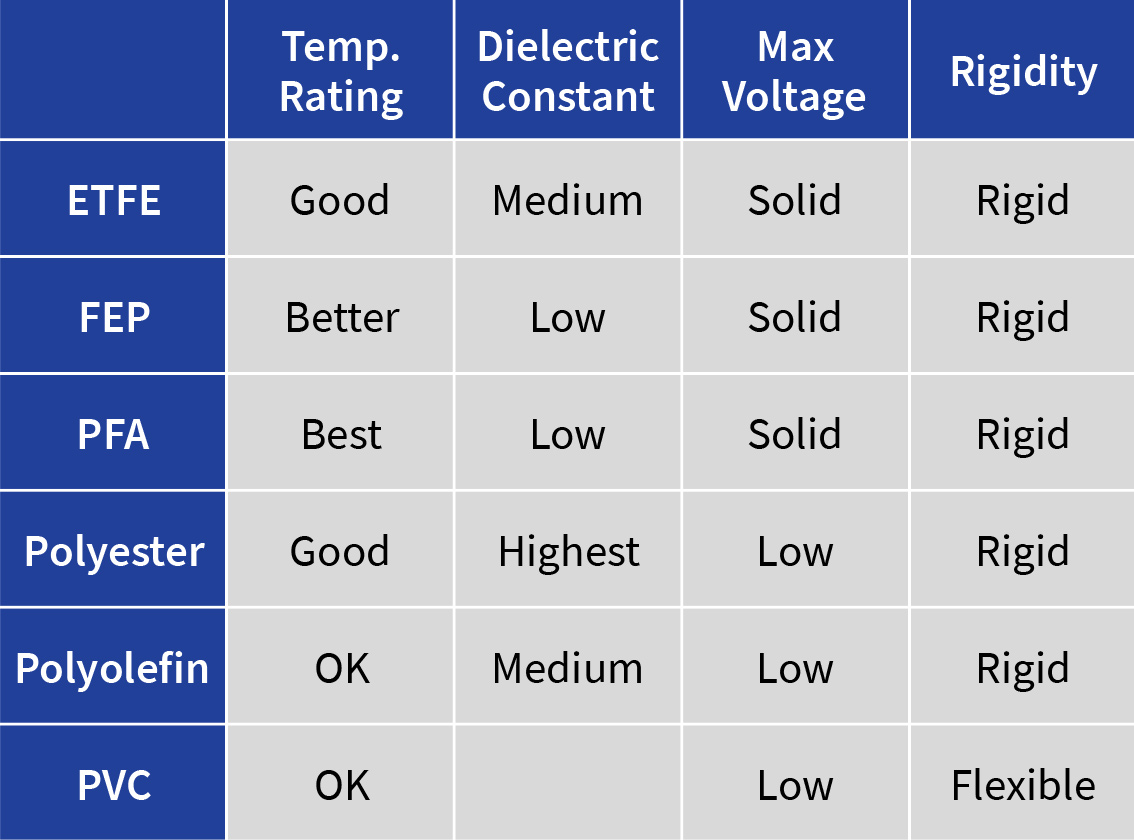 Jacket insulations are usually limited to PVC, polyurethane, thermoplastic elastomer(TPE), silicone rubber, polyester, and fluoropolymers (PFA, FEP, and ETFE)depending upon the end-use application (See table under primary insulation for general polymer characteristics). Outer jacket insulations can be combined by twisting jackets together, molding a divider strip, or adding a zip jacket to combine them.